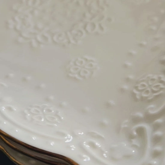 The Aurelia Dessert Plate celebrates craftsmanship and quiet luxury in every detail. Available in both round and square styles, each 6-inch plate is crafted from premium ceramic with softly scalloped edges, intricate embossing, and a refined gold inlay rim.